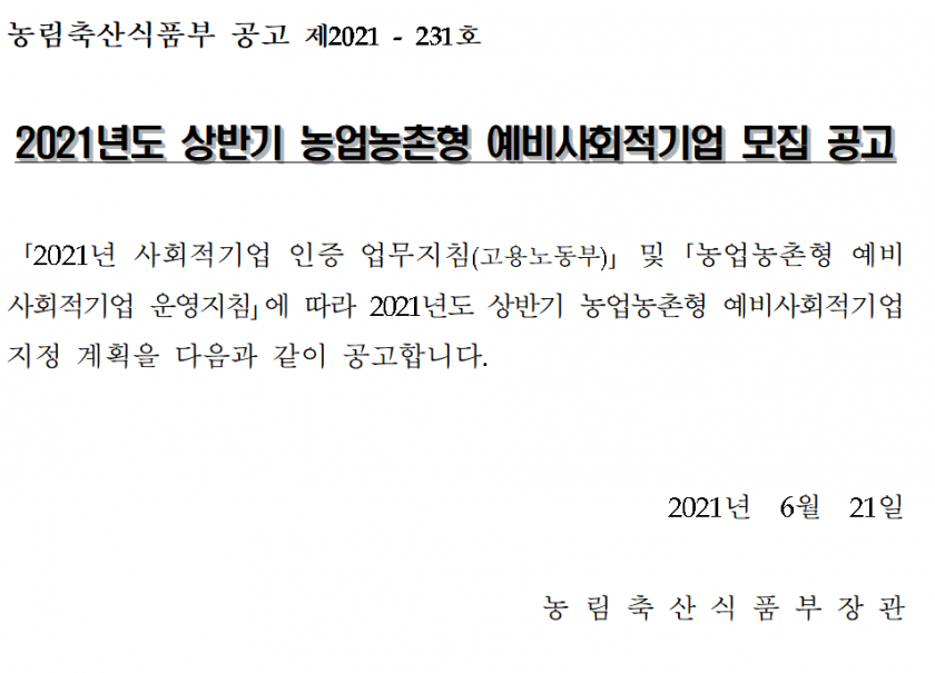 2021년도 상반기 농업농촌형 예비사회적기업 모집 공고(6/21~7/16)