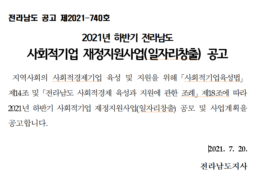 2021년 하반기 전라남도 사회적기업 재정지원사업(일자리창출) 공고 ( ~ 8/3, 18:00)