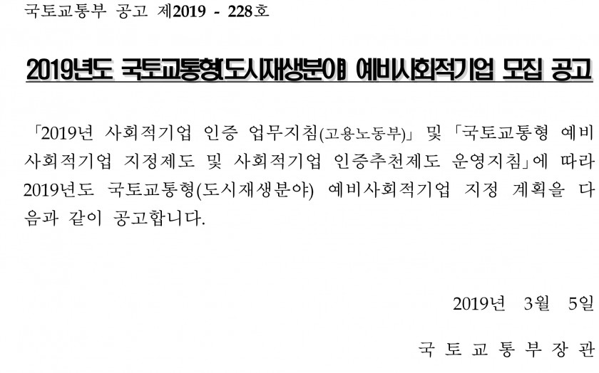 [국토교통부]2019년도 국토교통형(도시재생분야) 예비사회적기업 모집 공고(~5/3)