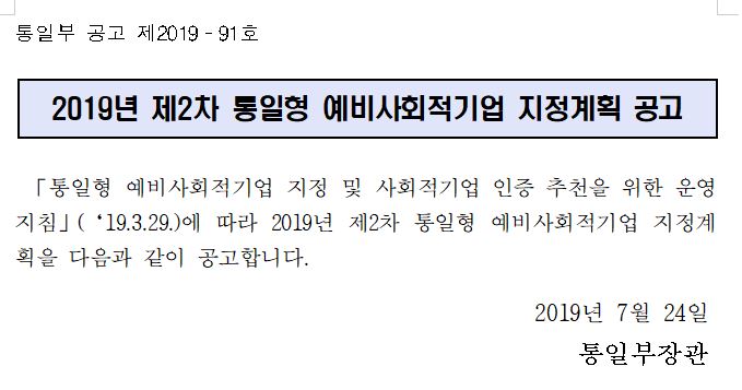 [통일부] 제2차 통일형 예비사회적기업 지정계획 공고(~8/20)