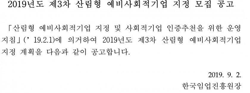 [한국임업진흥원] 2019 제3차 산림형 예비사회적기업 지정 모집 알림(~9/26)